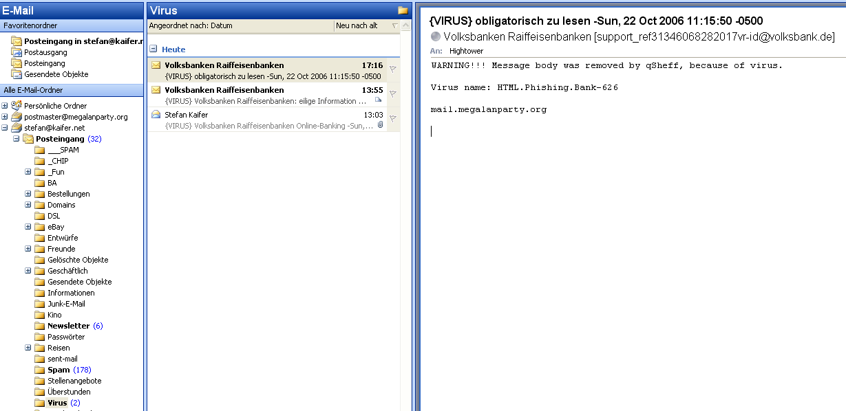Der E-Mailserver ist mit einem umfassendem SPAM- und Virenschutz ausgestattet. Dh. sämtliche ankommende E-Mails werden gefiltert. Alle Mails mit Viren werden sofort gelöscht, dem Empfänger wird darüber eine Infomail in seinem Ordner "Virus" abgelegt. Die Infomails werden nach 14 Tagen aus dem Ordner automatisch entfernt. Auf das Bild Klicken, um zu vergrössernDer E-Mail-Server ist Teil eines Antispam-Verbundes. Dh. jede E-Mail wird beim Ankommen sofort nach diversen Kriterien bewertet. darus ergibt sich eine Punktzahl (Scores). Wenn diese Zahl 5 oder höher ist, wird die E-Mail als Spam klassifiziert. Die E-Mail wird beim Empfänger in seinem Ordner "Spam" abgespeichert. Im Body der E-Mail steht eine genaue Erklärung über die Bewertung. Die ursprüngliche E-Mail gilt als nicht verloren, sondern liegt als Anhang in der jeweiligen E-Mail vor: Auf das Bild Klicken, um zu vergrössernDer Spamfilter ist auch mit einer AutoLearn-Funktion ausgestattet. Dh. der Filter bildet sich ständig nach gewissen Regeln fort. Desweiteren kann der Spamfilter von den Benutzern gelernt werden. Dh. unter Umständen könnten nicht SPAM-E-Mails (NOSPAM oder Ham in der Fachsprache) als SPAM deklariert werden. In diesem Fall sollte die NOSPAM-E-Mail als ANHANG an die folgende E-Mail-Adresse weitergeleitet werden: